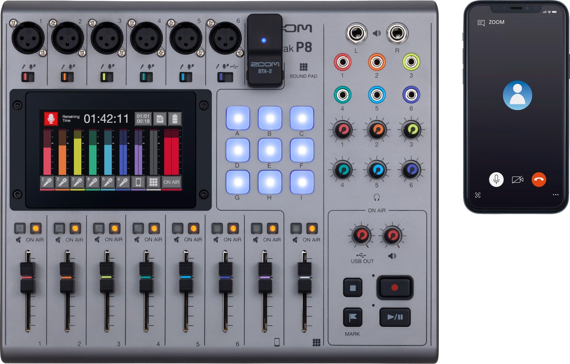The P8 features a dedicated channel for recording phone calls. And channel six can be switched to USB mode to record your guests via computer. Both options include a Mix-Minus feature to prevent echo and feedback for the caller.