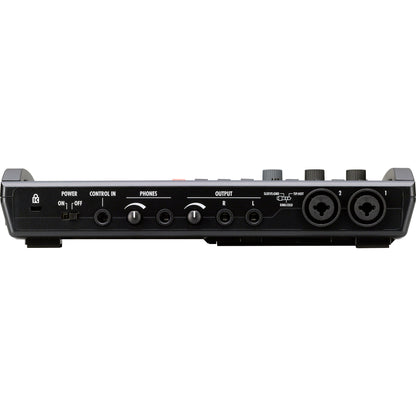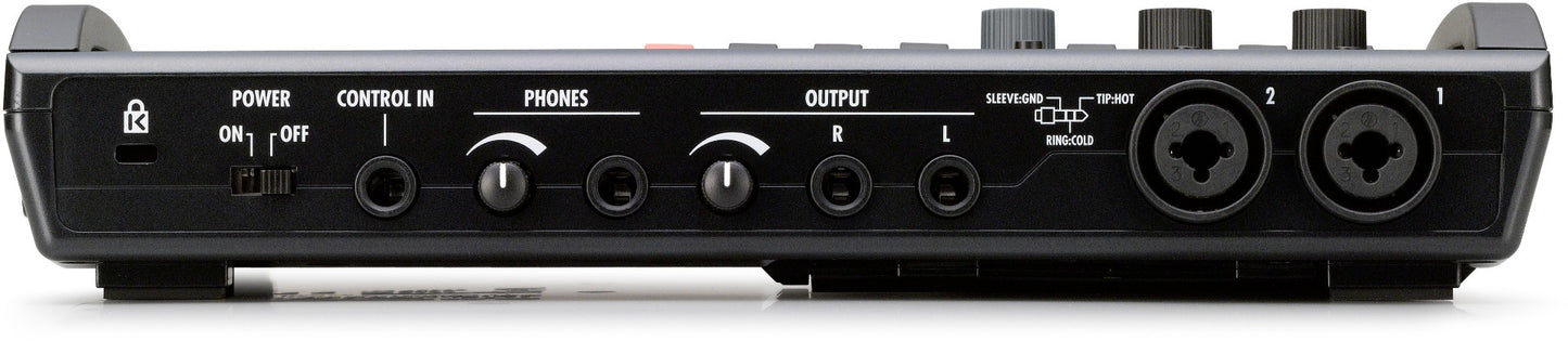 The R8 provides dual inputs on combo connectors which can accept either XLR or ¼" balanced or unbalanced cables. Both can handle mic- and line-level signals, and Input 1 can also handle instrument-level signals from passive or active electric guitars and basses. Phantom power of +24 or +48 volts can be applied to both inputs, allowing the use of external condenser microphones. There are also dual balanced ¼" TRS output jacks and a headphone output with a dedicated volume control.
